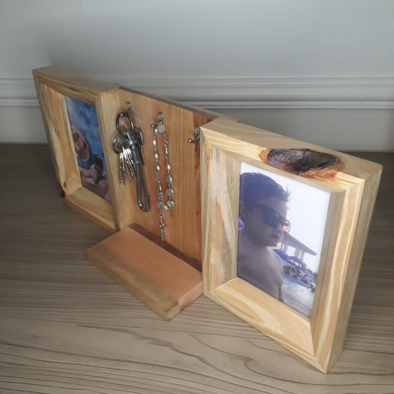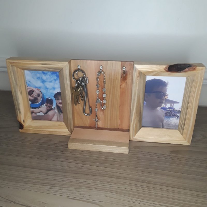 Porta Chaves com 3 ganchos, mais dois Porta Retratos (foto padrão 10x15) medindo 44cm de largura por 20 cm de altura e 9cm de profundidade, confeccionado em madeira maciça.