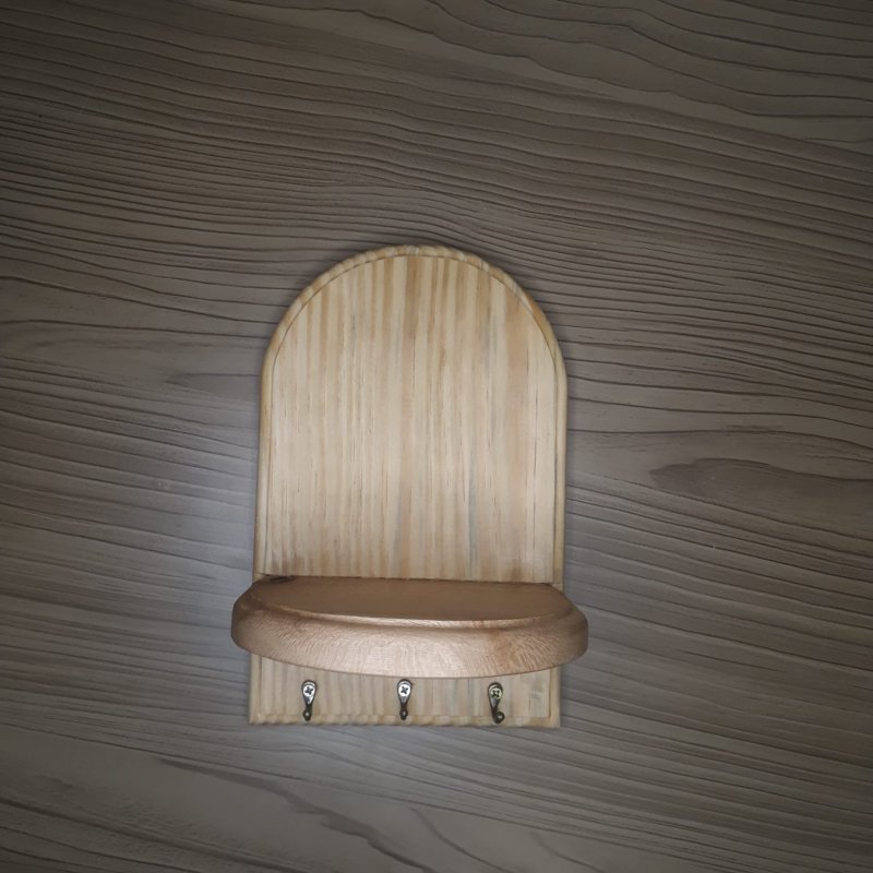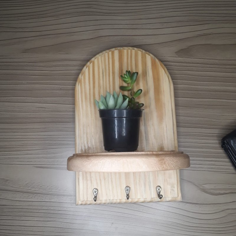 Porta chaves de parede com 3 ganchos e base de apoio confeccionado em madeira maciça medindo aproximadamente 22cm de altura por 14com de largura