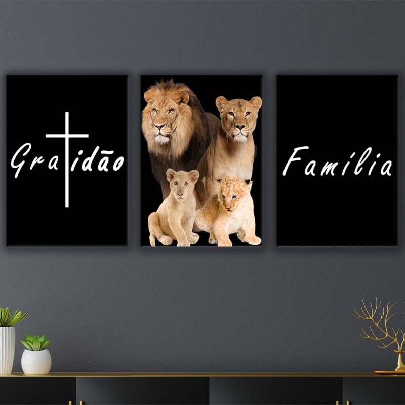Trio de quadros fam´lia gratidão Casal leão e dois filhotes